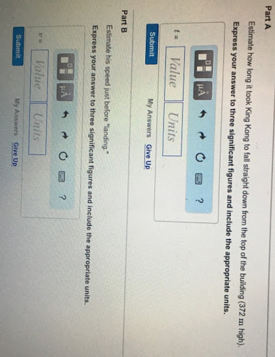 Estimate How Long It Took King Kong To Fall. Part a estimate how long it took king kong to fall straight down from the top of the building (382 m high) express your answer to three significant figures and include the appropriate units. Estimate how long it took king kong to fall straight down.